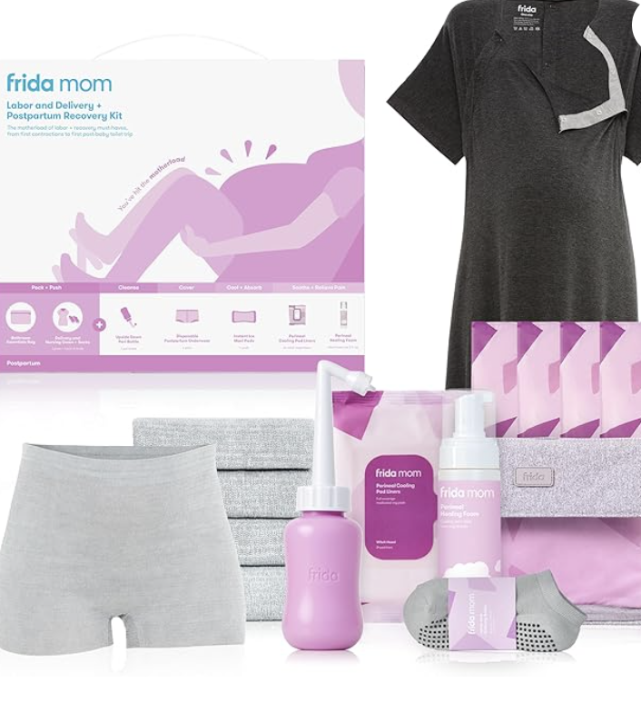 Frida Mom 15pc Labor & Postpartum Kit Gift Set for Baby Showers & Mom to Be, Includes Peri Bottle, Nursing Gown, Disposable Underwear, Ice Maxi Pads, Pad Liners, Perineal Foam, Socks & Toiletry Bag.More Info
